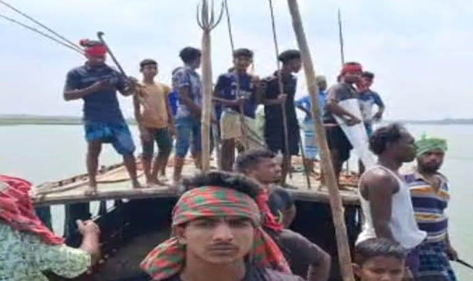 নবীনগরে মেঘনা নদীতে বালু মহাল বন্ধের দাবিতে দেশীয় অস্ত্র নিয়ে গ্রামবাসীর মহড়া