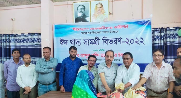 হবিগঞ্জের শায়েস্তাগঞ্জে বাংলাদেশ মানবাধিকার কমিশন শায়েস্তাগঞ্জ উপজেলা শাখার উদ্যোগে অর্ধশতাধিক নারী পুরুষের মাঝে ঈদ উপহার হিসেবে খাদ্য সামগ্রী বিতরন করা হয়েছে।